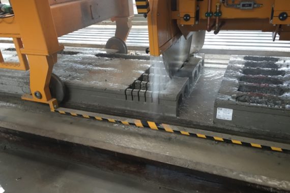 Формовочная дорожка представляет собой площадку со стальным покрытием, на которой происходит процесс изготовления ЖБИ. Вдоль нее двигается экструдер, здесь происходит армирование и затвердевание изделия, а также его распил.